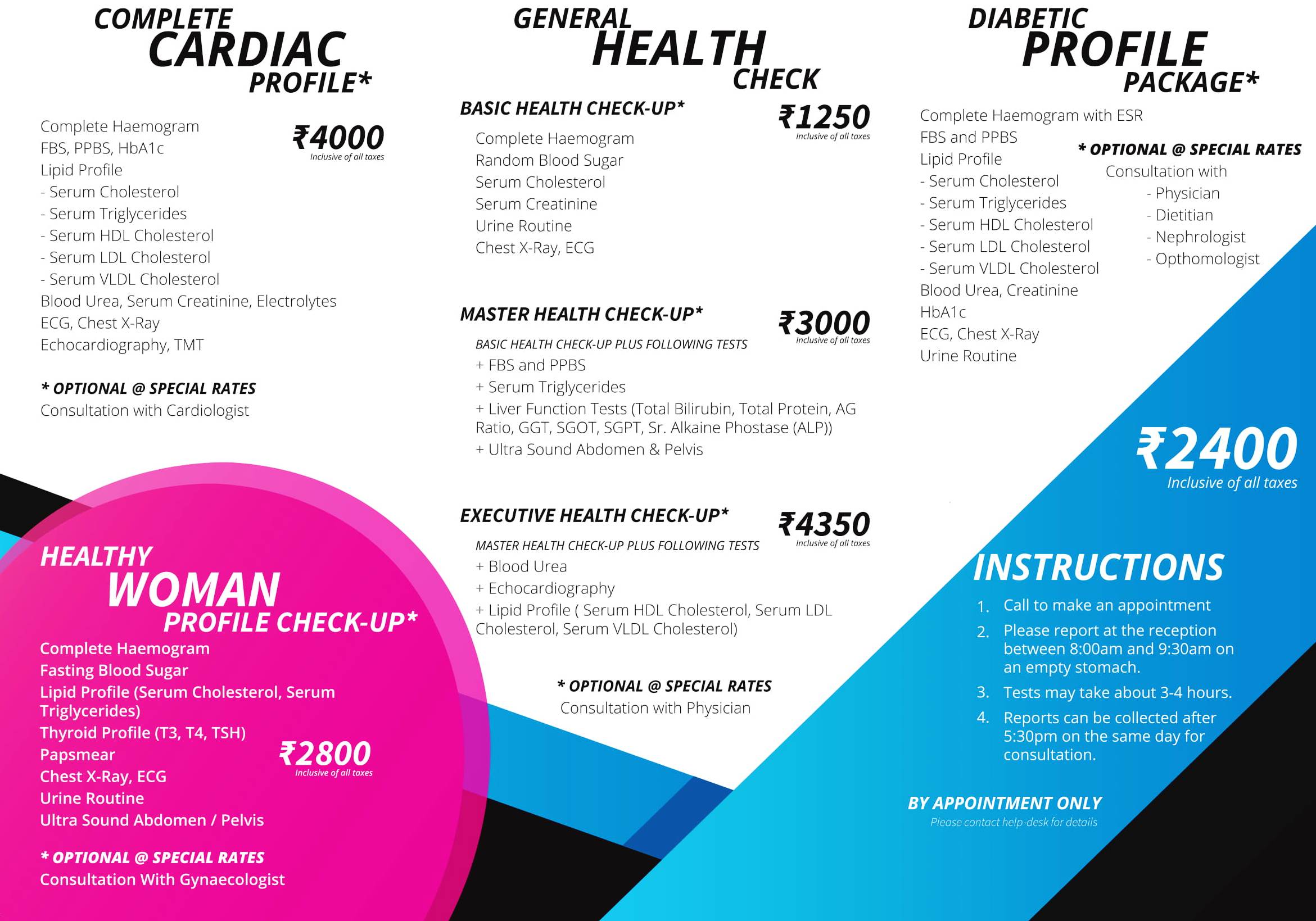 | Basic Health Check | Complete Haemogram, Random Blood Sugar, Serum Cholesterol, Serum Creatinine, Urine Routine, Chest X-Ray, ECG, Consult with physician | Rs.1250/- |